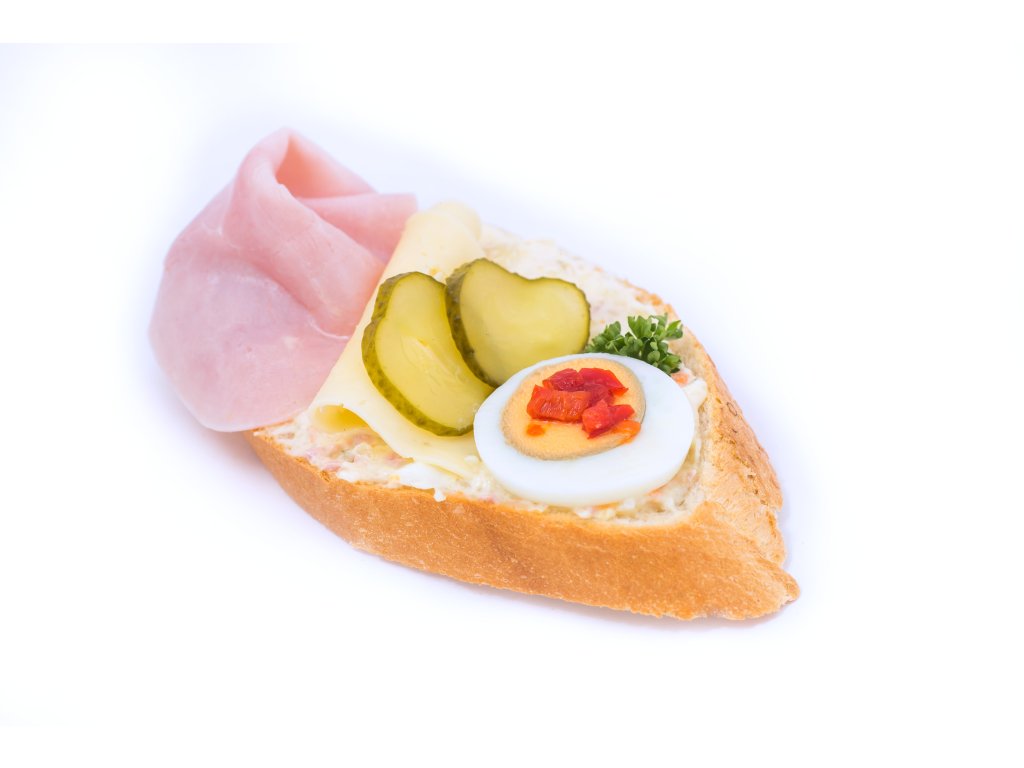 Bezlepková veka, bramborový salát, vepřová šunka, sýr Gouda, vejce, zelenina.