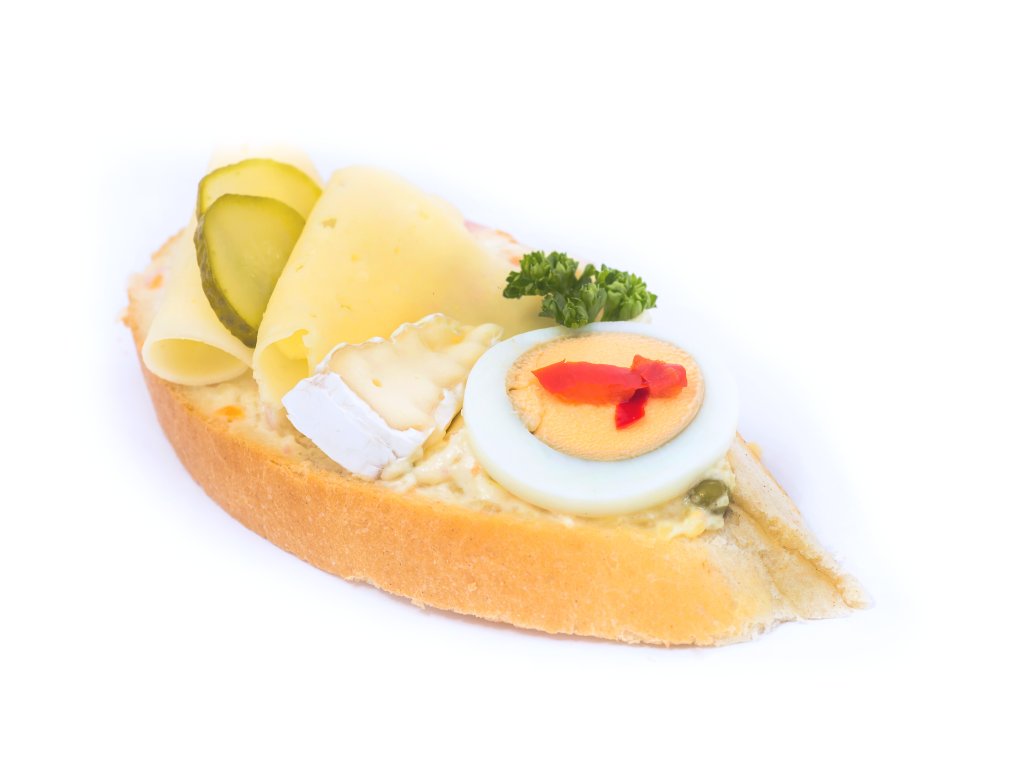 Bezlepková veka (chleba), bramborový salát, vejce, sýr Gouda, camembert, zelenina.