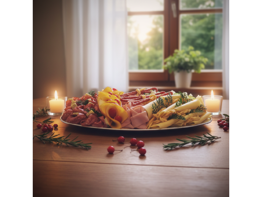 Vepřová šunka, herkules, uzený sýr, gouda, korbačiky, vepřové klobásky, zelenina.